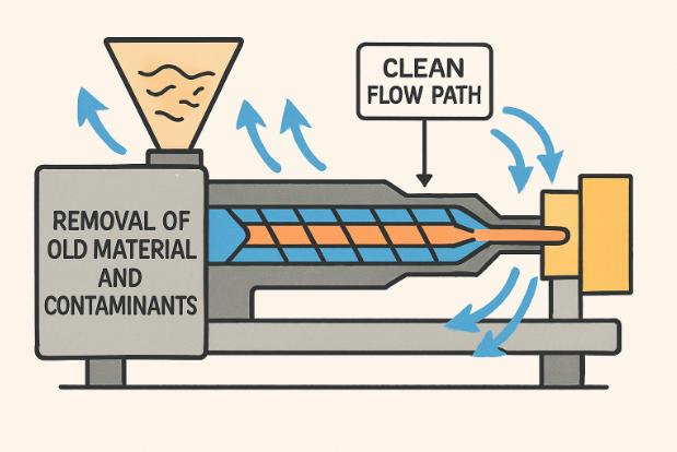 Purging is the thorough cleaning of the internal surfaces of plastics processing equipment, such as injection molders, extruders, and blow molders, to remove old material, residual additives, and contaminants. Without regular, effective purging, residues can lead to numerous problems: black specks, color streaks, and even chemical degradation are all signs of inadequate cleaning. Over time, these contaminants may cause batch-to-batch inconsistencies, ultimately resulting in rejected products or unplanned shutdowns.